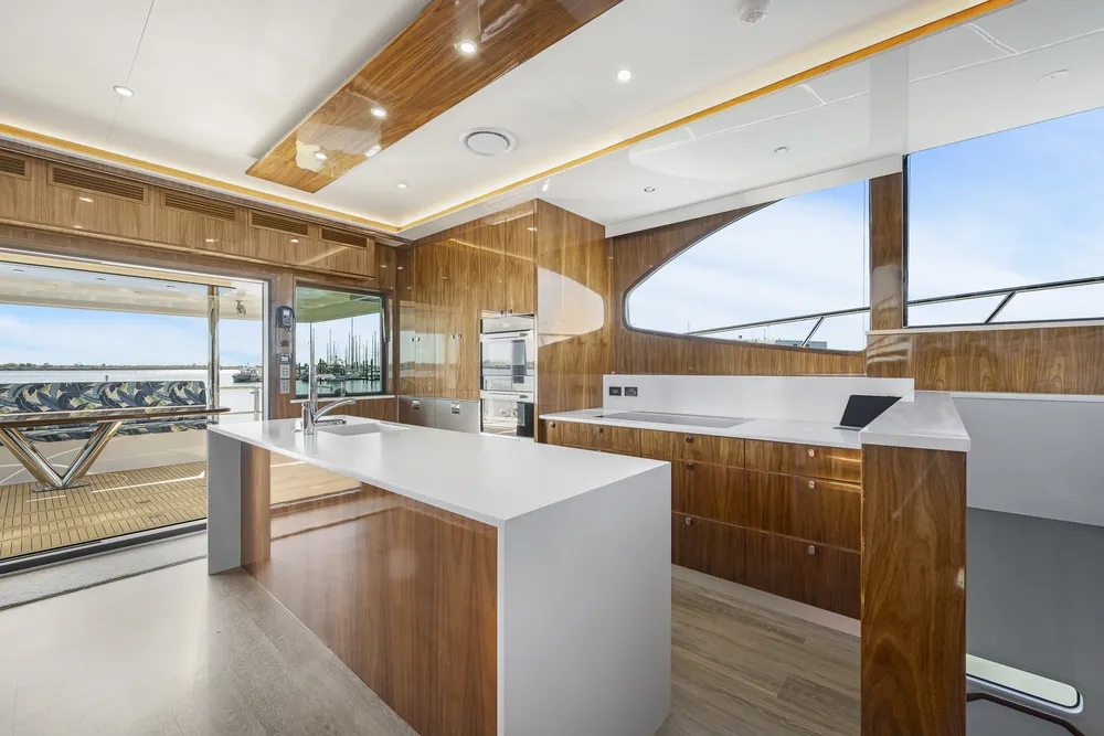 With Elysian, every detail has been designed to elevate time on the water — from a galley and dining area that spills onto an aft deck with seating for eight, to a full-service outdoor BBQ bar primed for long summer evenings.