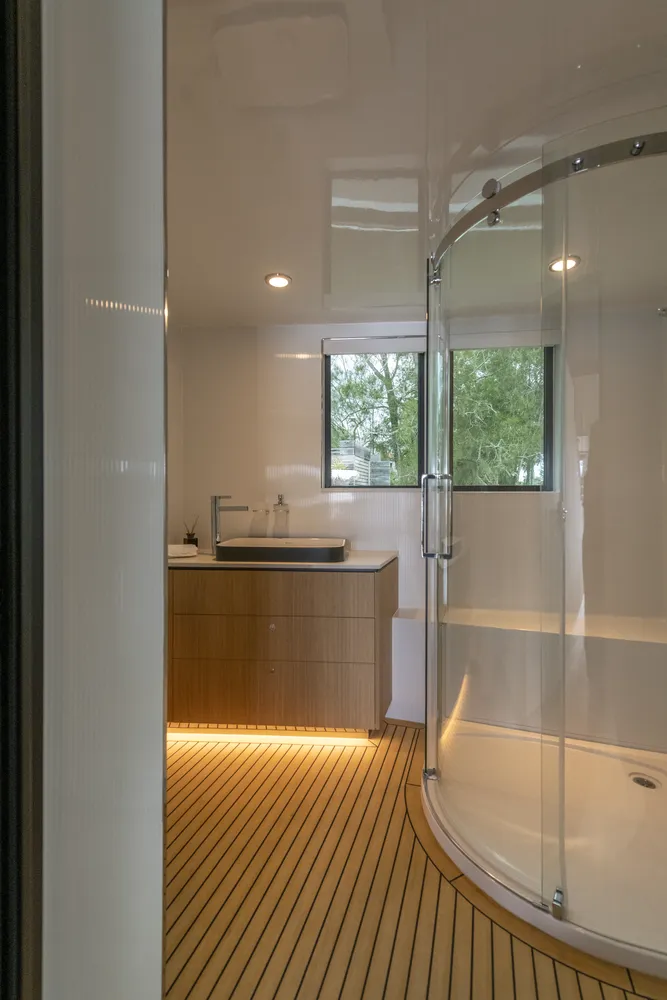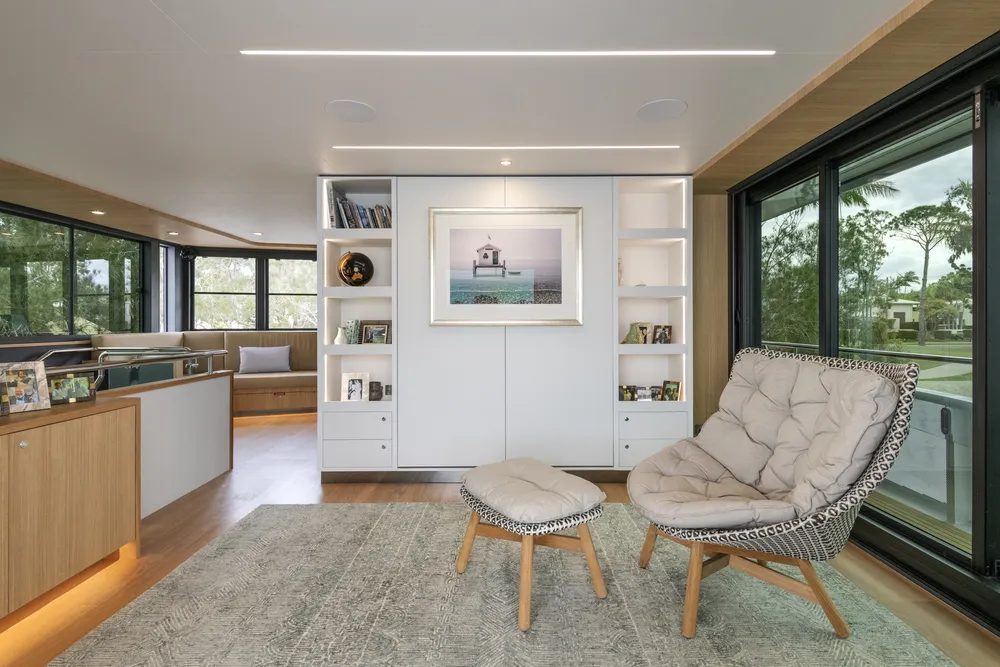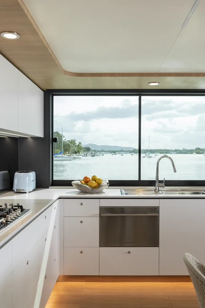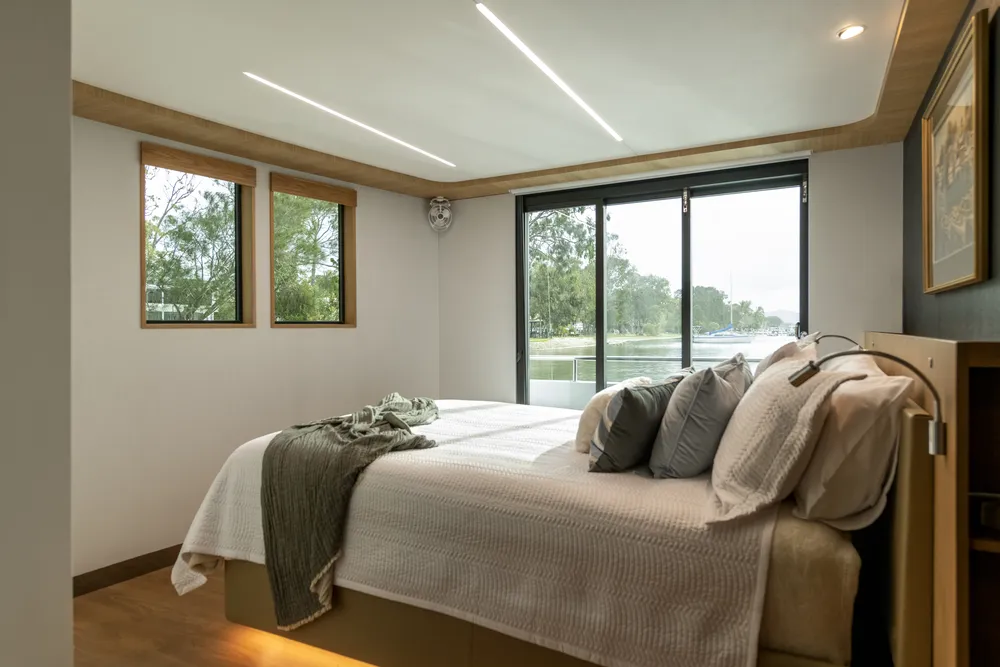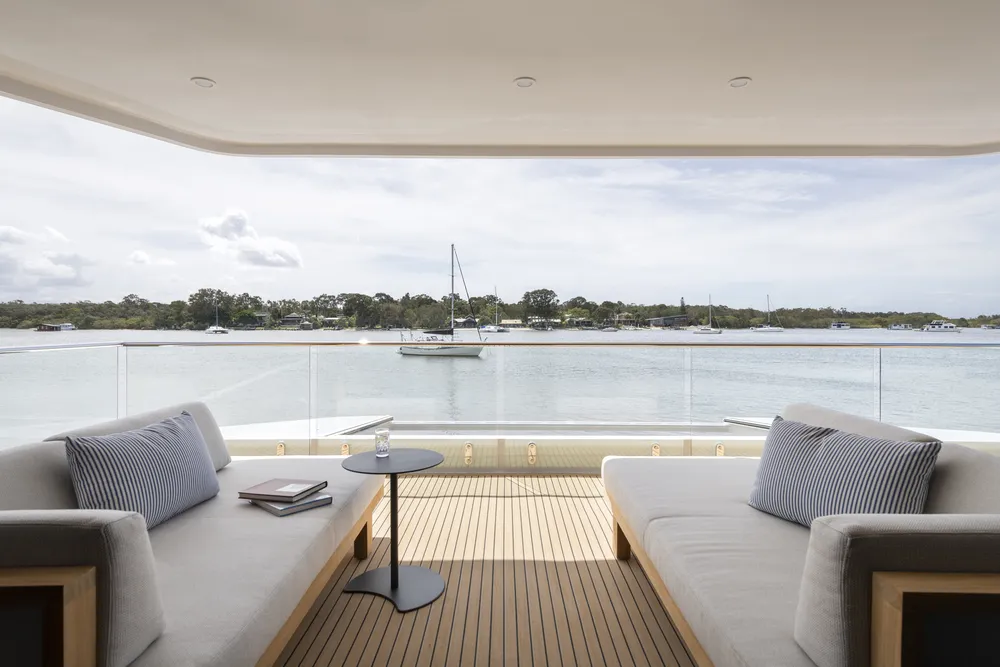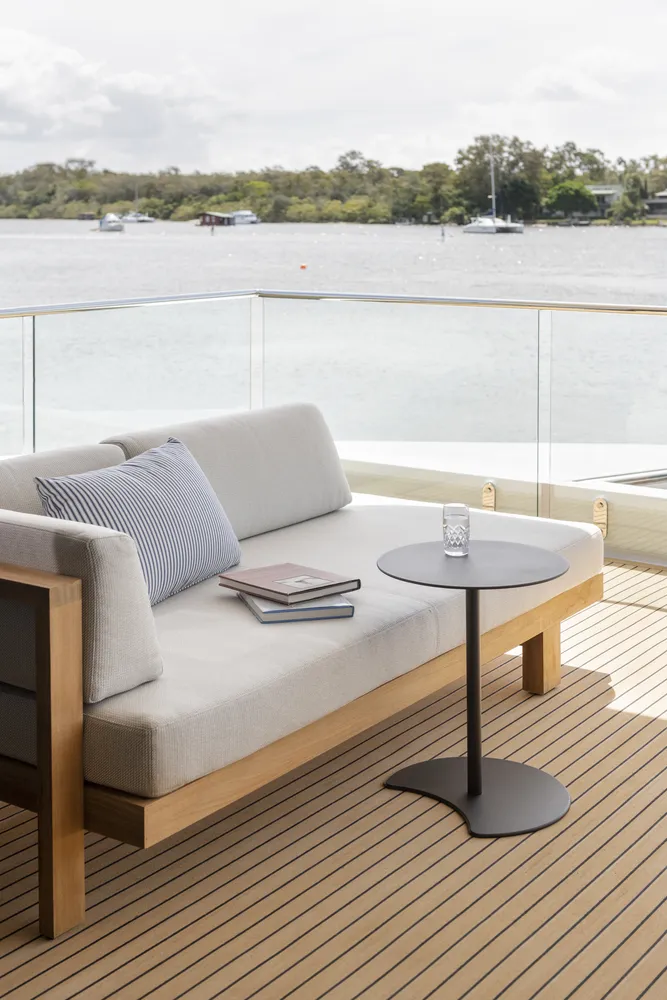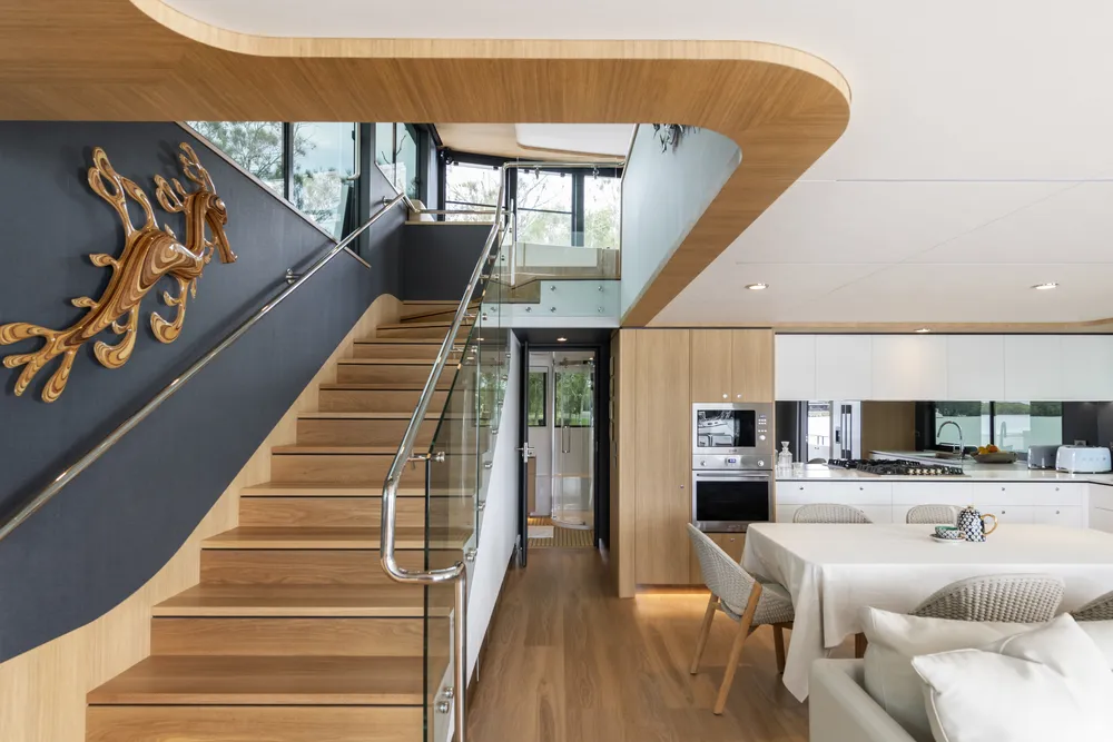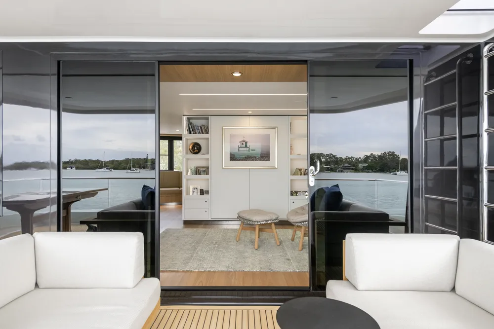 Every element of Margaret is designed to celebrate her setting. Expansive glazing floods the interiors with light and uninterrupted river views, while performance glass and concealed blinds ensure privacy and comfort. Sliding doors and fold-down balconies dissolve boundaries between inside and out, connecting spacious saloons with shaded decks and a hydraulic swim platform at the water’s edge.