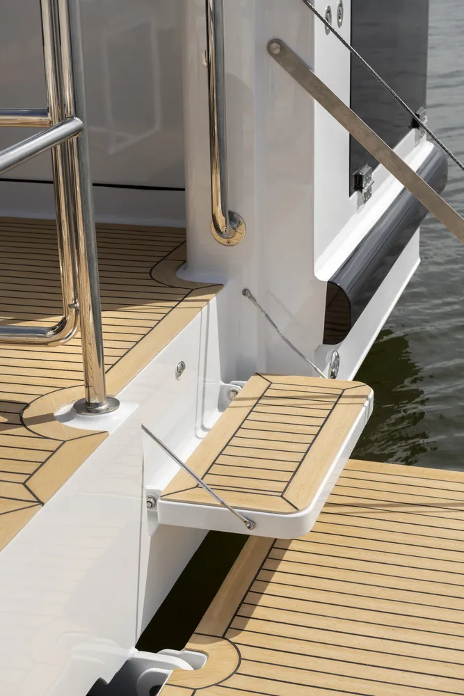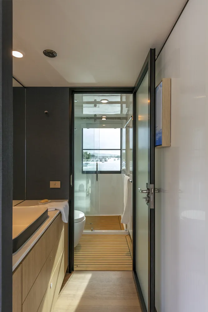 Her interiors are light, modern and family-oriented, with American oak, teak, and custom-built furnishings chosen for warmth and durability. Multi-functional spaces transform with ease: a second saloon converts into a guest stateroom, lounge seating becomes formal dining for twenty, and entertainment areas open wide to invite in breezes and sunsets.